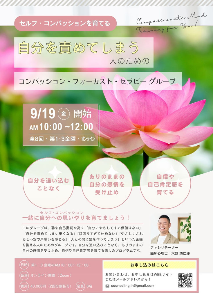 - 用いる心理療法:コンパッション・フォーカスト・セラピー(CFT)。CFTは、自分への思いやり(セルフ・コンパッション)を高め、恥や自己批判を和らげることでメンタルヘルスを改善する効果が実証されています。たとえば、うつ病や不安障害、境界性パーソナリティ障害、摂食障害、依存症など、感情調節の課題を抱えた疾患への有効性が示されています。マインドフルネスに基づく第3世代の認知行動療法から発展した新しい統合的心理療法です。ここでは個人療法ではなくグループ療法として提供しています。
